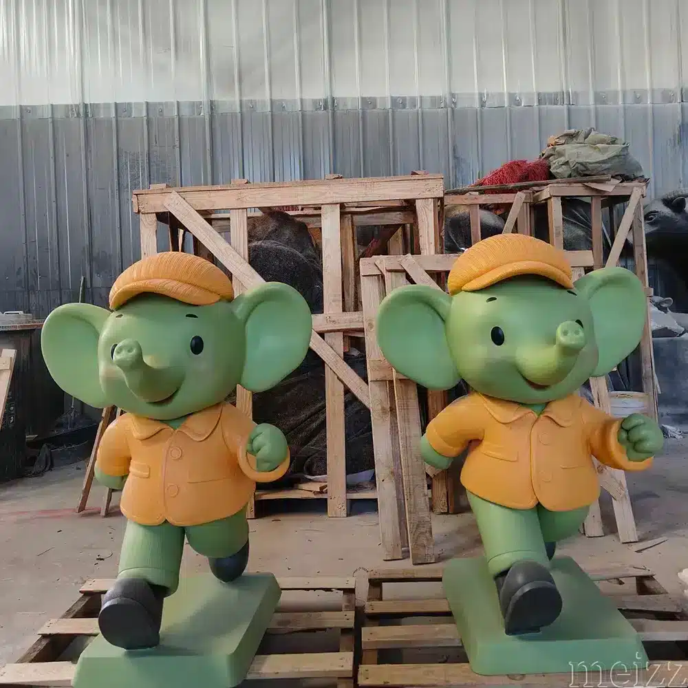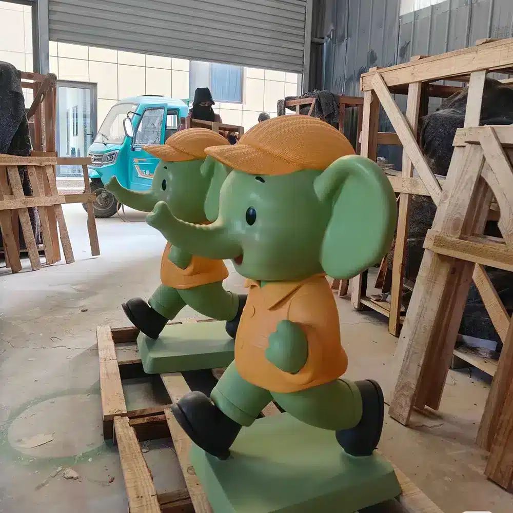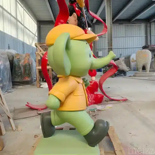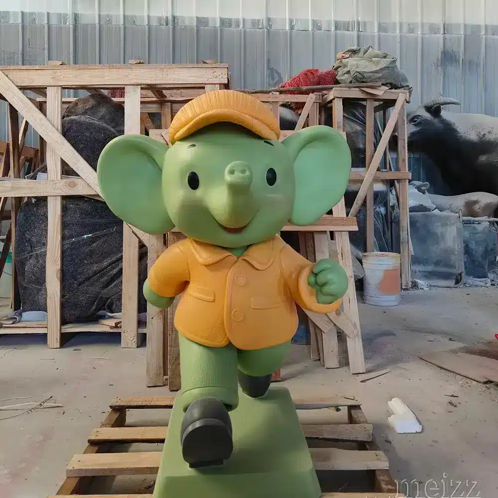 Unlike static statues, this elephant is sculpted in a running posture, symbolizing vitality, joy, and forward momentum. Furthermore, the rounded body proportions maintain a cute cartoon style, while the bright color combination increases visibility in high-traffic areas. In addition, from the smiling face to the carefully crafted clothing folds, every detail reinforces the energetic and friendly character image, making it ideal for interactive and children-oriented space.